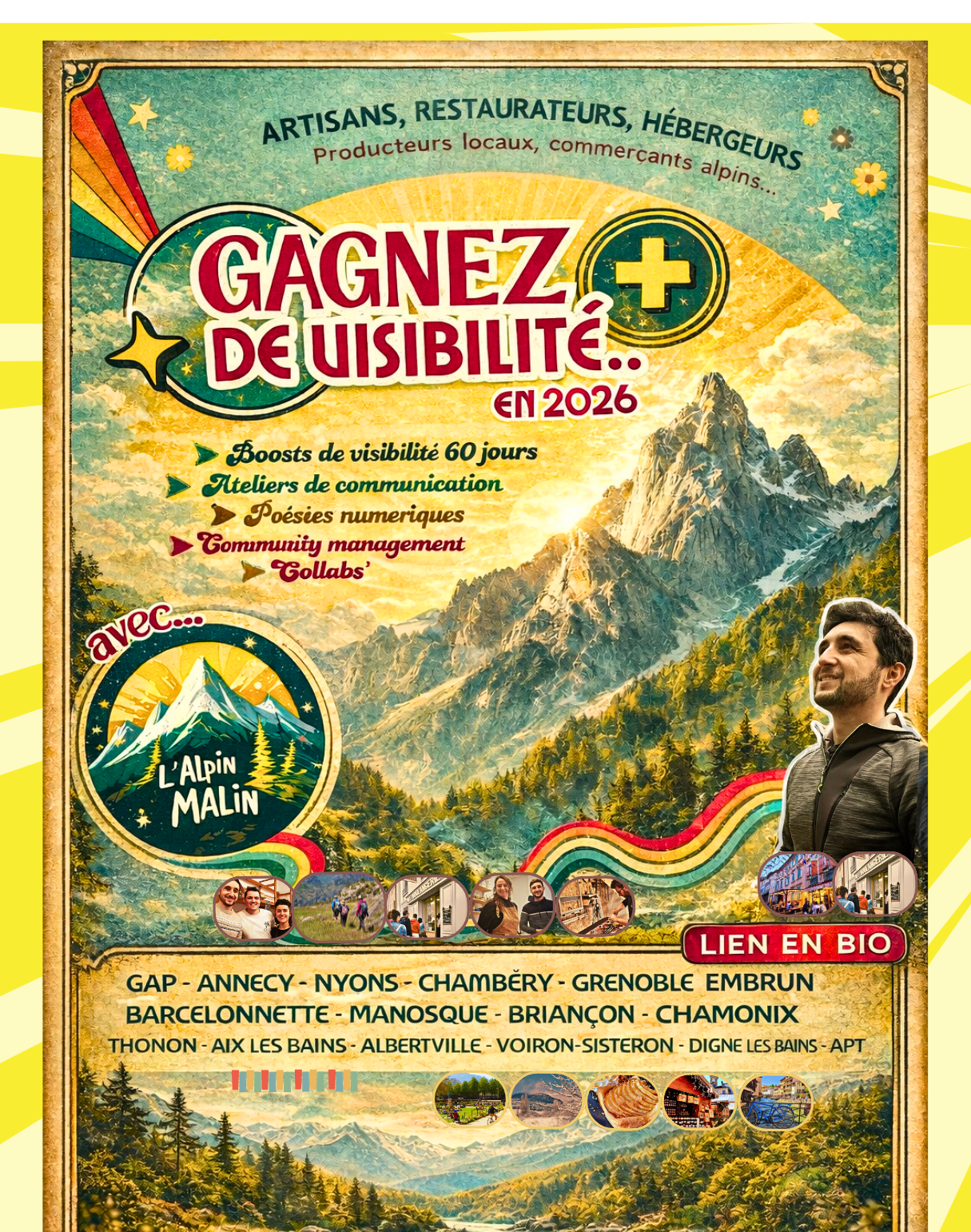 L’Alpin Malin, c’est aussi une offre professionnelle en visibilité digitale dédiée à celles et ceux qui font battre le cœur des Alpes : artisans, hébergeurs, restaurateurs, producteurs locaux, stations de montagne 4 saisons, petites marques locales… devenez partenaires et explorez la grille tarifaire en remplissant le formulaire !